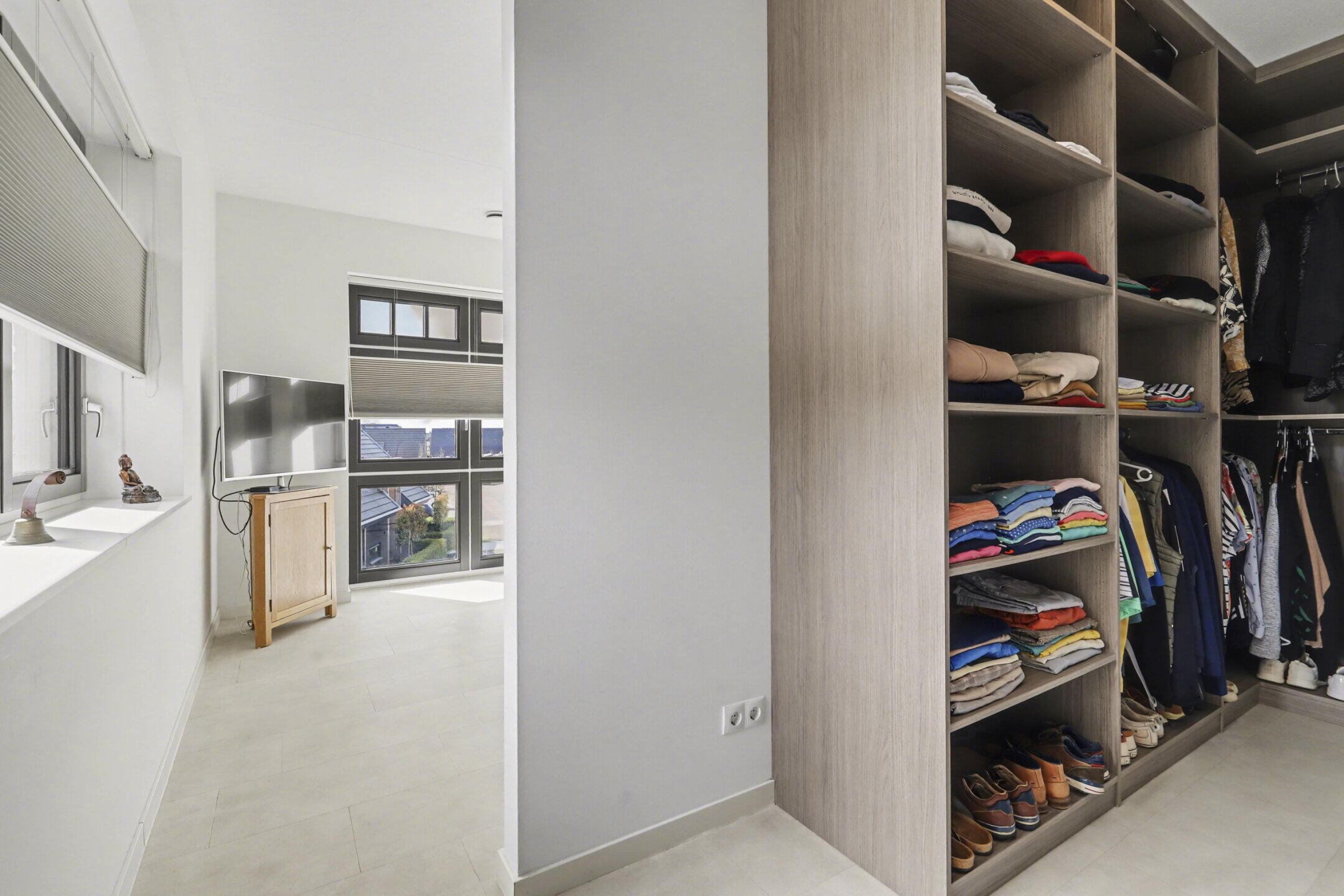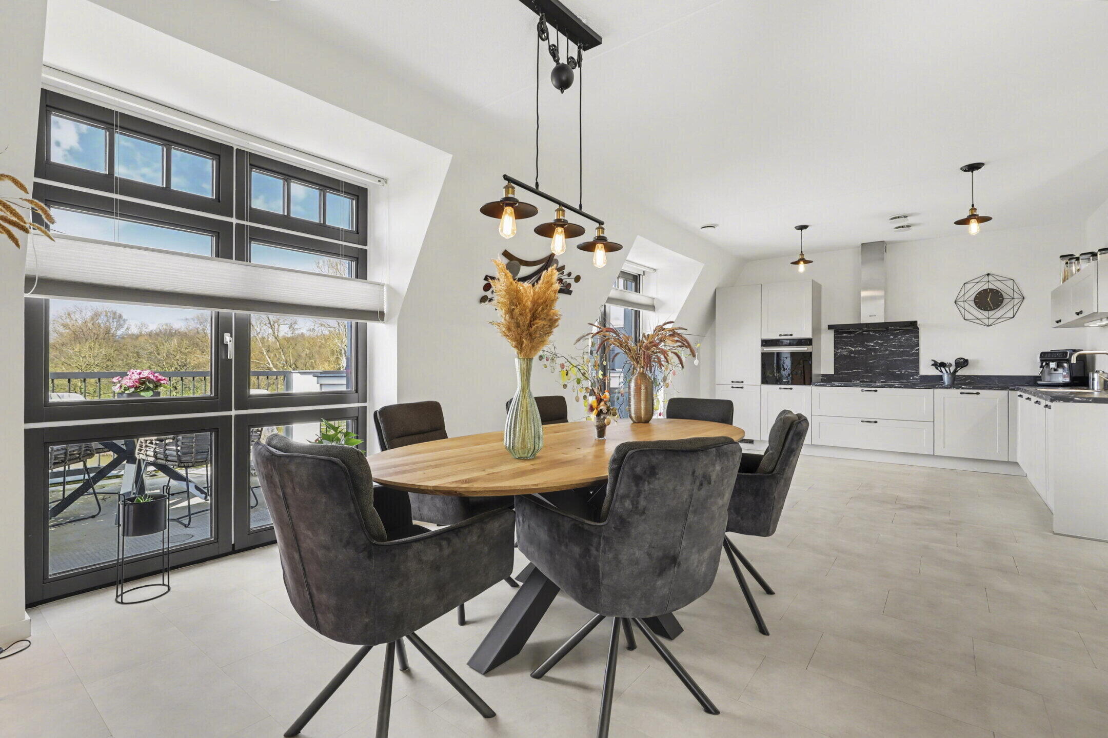 Bij binnenkomst in de woonkamer valt je direct op hoe het licht en het uitzicht de ruimte bepalen. De kamer is groots opgezet en vloeit naadloos over in het ruime dakterras van 22 m². Hier geniet je in alle privacy van de rust, met het groen als decor. De afwerking is hoogwaardig: een smaakvolle PVC-vloer met vloerverwarming, strakke wanden en een keuken die is ontworpen voor als je van koken én gezelschap houdt. Dankzij de drie slaapkamers en een praktische inloopkast heb je aan leefruimte geen gebrek, of je nu een logeerkamer, hobbyruimte of een royaal thuiskantoor wenst.